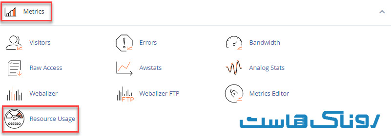 - بخش Metrics (آمار و متریکها) را انتخاب کرده و روی زیرگزینه Resource Usage (مصرف منابع) کلیک کنید.